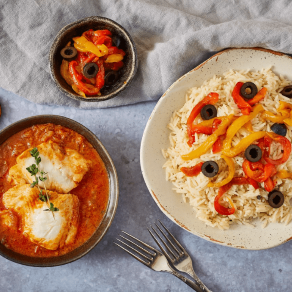 Pearly white cod fillets are cooked in a zesty onion sauce, with fragrant grainsÂ
